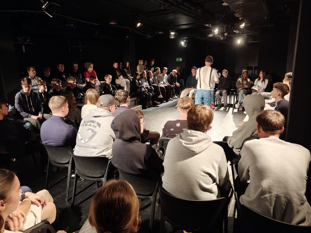 Środa to świetna okazja, aby wyjść do Teatr Gdynia Główna . Klasy 1 A, 2AK, 3K spędziły dziś dzień na niecodziennym przedstawieniem w którym sami wzięli udział. Spektakl „Strona bierna” ukazuje bowiem mechanizmy przemocy rówieśniczej, angażując widzów do aktywnego poszukiwania rozwiązań. Skupia się nie tylko na osobach doświadczających agresji oraz jej sprawcach, ale przede wszystkim na roli świadków, których reakcja może albo wzmacniać, albo hamować akty przemocy. Podczas spotkania mieliśmy szansę wejść w rolę Kuby i podjąć decyzje, które wpłyną na dalszy przebieg wydarzeń. Celem spektaklu jest rozwijanie kompetencji społecznych młodzieży, zwiększanie ich gotowości do reagowania oraz poszukiwanie skutecznych strategii przeciwdziałania przemocy rówieśniczej.